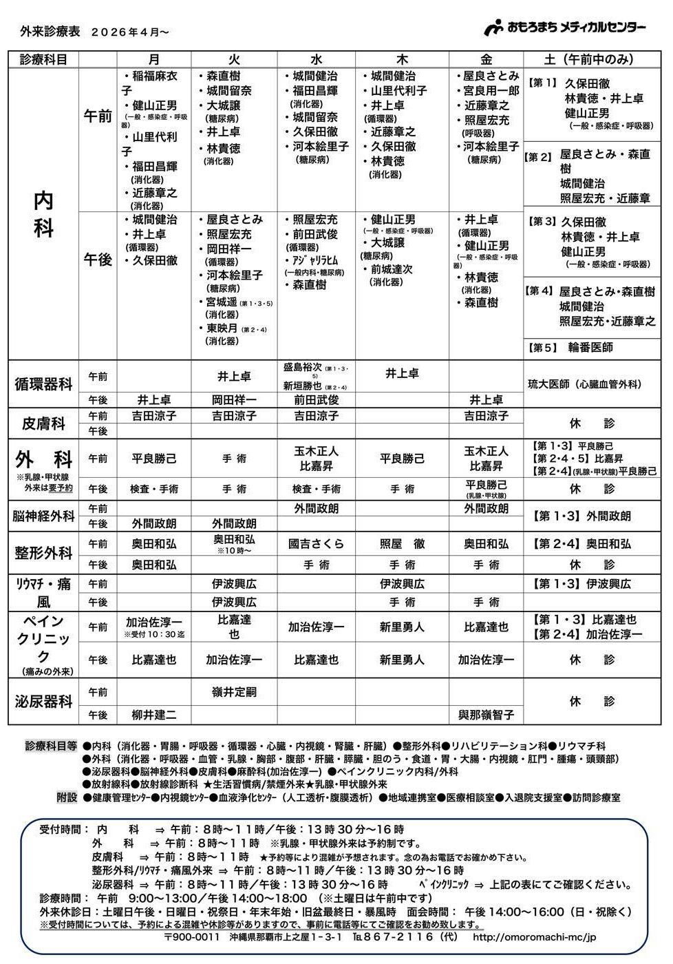第1週:久保田徹、健山正男、井上卓、林貴徳 第2週:屋良さとみ、森直樹、城間健治、照屋宏充、近藤章之 第3週:久保田徹、健山正男、井上卓、林貴徳 第4週:屋良さとみ、森直樹、照屋宏充、城間健治、近藤章之 第5週:輪番医師 |